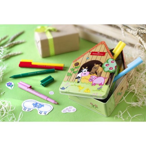 Souprava 18 kusů fixů různých barev se spojovacími klipy v dárkové plechové dóze s motivem farmářského domu. 10 ks spojovacích klipů je součástí balení navíc.
