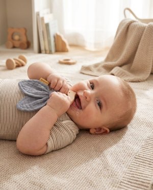 Kousátko s mušelínovou plenou je ideální sada, když se dítěti prořezávají zoubky. Kousátko je vyrobeno z bukového dřeva šetrného ke středu a měkké mušelínové látky. Zcela bezpečné pro děti přináší uklidňující úlevu při prořezávání zoubků. Kousátko lze použít také jako hračku pro miminka. Kousátko se dokonale hodí k našim dalším mušelínovým výrobkům a vytváří tak krásnou sadu, kterou lze darovat na dětskou oslavu.