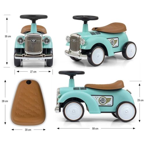 Dětské odrážedlo Retro zve malé cestovatele na retro jízdu. Upoutá svými oku lahodícími barvami. Je bohatě vybaveno. Toto autíčko má volant se zvukem a tvarované sedadlo. Poskytne vašemu dítěti skvělou zábavu při řízení a rozvíjí jeho smysl pro rovnováhu a všeobecné motorické dovednosti. Autíčko má lehkou plastovou konstrukci a ergonomické tvary. Otočný volant autíčka Retro umožňuje náročné manévry doma i na procházkách. Kola tohoto krásného vozidla jsou vyrobena z měkké pěny EVA. Retro autíčko může vaše dítě používat jako své první vozidlo s opravdovým volantem a klaksonem, dále jako kočárek s otevřeným úložným prostorem na hračky (malý kufr), imitací palivové nádrže na zadní části vozidla a přední částí auta - mřížkou ve stříbrné barvě. Vozítko Royce je určeno všem dětem, které umí samostatně sedět. Vozítko lze používat v interiéru i exteriéru a zpříjemní vašemu dítěti čas strávený na procházce.