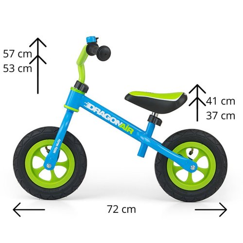 Dětské odrážedlo-kolo Milly Mally DRAGON AIR je ideální, když se dítě učí udržet rovnováhu. Díky širokým nafukovacím gumovým pneumatikám z odolného materiálu zabezpečí stabilitu a bezpečnost na různých površích. Nastavitelné řídítka a sedlo zabezpečí, že kolo "poroste" s malým cyklistou. Neklouzavé rukojeti a vhodně profilované sedlo poskytne pohodlí při objevování nových "cyklistických tras". <BR>Charakteristika:<BR>- nastavitelná výška sedadla<BR>- výškově nastavitelná řídítka<BR>- stabilní a lehká ocelová konstrukce<BR>- protiskluzové rukojeti z gumového materiálu<BR>- pohodlné, měkké sedadlo<BR>- nafukovací kola 10" cm<BR>- zvonek<BR>- vhodné od 2-5 let<BR>- maximální zatížení až 20 kg<BR>- váha 3,25 kg<BR>- odolnější lak vůči poškrábání - sprejová metoda<BR>- splňuje evropské bezpečnostní normy<BR>- délka od zadního k přednímu kolečku 72 cm<BR>- výška řídítek cca 55-61 cm, šířka 46 cm<BR>- výška sedadla 37-41 cm