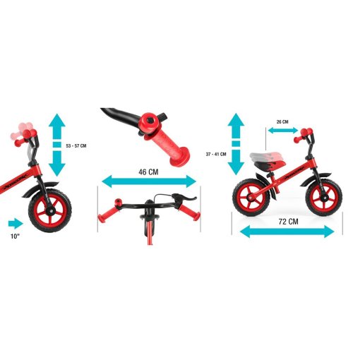 Dětské odrážedlo-kolo Milly Mally Dragon.<BR>- nastavitelná výška sedadla<BR>- výškově nastavitelná řídítka<BR>- stabilní a lehká ocelová konstrukce<BR>- protiskluzové rukojeti z gumového materiálu<BR>- pohodlné, měkké sedadlo<BR>- pěnová kola 10" cm<BR>- zvonek<BR>- brzda<BR>- maximální zatížení až 20 kg<BR>- váha 3 kg<BR>- délka od zadního k přednímu kolečku 70 cm<BR>- výška řídítek 54-60 cm, šířka 46 cm<BR>- výška sedadla 33-43 cm<BR>- průměr kolečka cca 25 cm