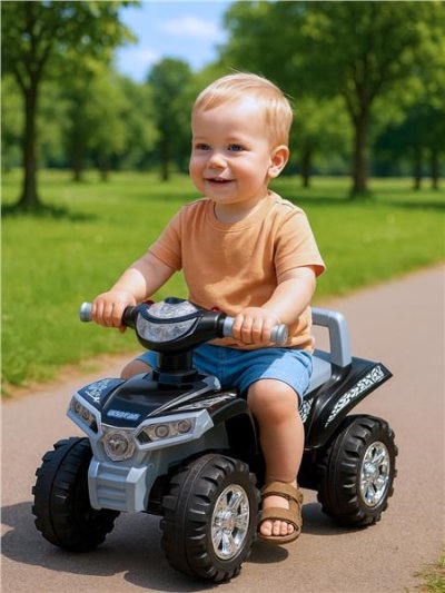 Skvělá Čtyřkolka Baby Mix se třemi melodiemi, klaksonem a blikajícími světýlky na řídítkách. Čtyřkolka má veselé barvy a je vyrobena z kvalitního a pevného plastového materiálu. Odrážedlo pomáhá rozvíjet motorické schopnosti dítěte a zaručí mu spoustu zábavy a legrace. Je určeno jak pro nejmenší děti, které už umí sedět, tak i pro děti, které se už naučily chodit. S čtyřkolkou si Vaše dítě užije spoustu legrace a zábavy. Naše super čtyřkolka skvěle vypadá, má komfortní široké sedadlo, široká řídítka a velká plastová kola. Na řídítkách má efektní houkačku a tlačítko se třemi uloženými melodiemi. Baterie nejsou součástí balení (2x AA 1.5V). Barvy samolepek se mohou lišit dle aktuální nabídky.