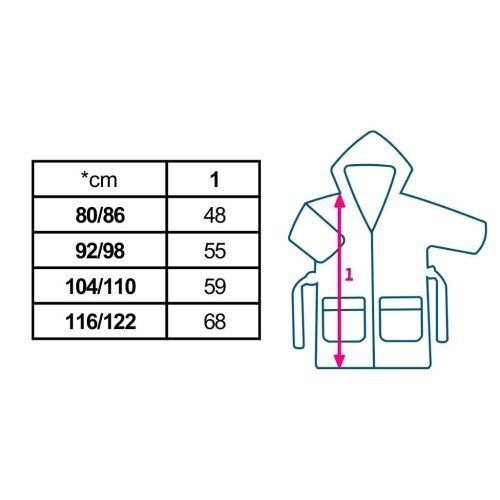 Praktický a kvalitní dětský župan s kapucí české značky New Baby. Župan je vyroben z příjemného a hřejivého froté materiálu. Kapucka chrání mokrou hlavičku před chladem a měkký, teplý materiál je ideální pro citlivou dětskou pokožku. Dětský župan se zavazuje se na všitý pásek. Dítě pásek neztrácí a nevadí při chůzi. Další výhodou našeho županu jsou hlubší kapsičky pro potřeby dítěte. Je Ideální nejen po koupeli, ale také po koupání v bazénu či v moři. Rozměry jsou uvedeny na poslední fotografii. Složení: 100% bavlna. OEKO-TEX STANDARD 100. 240g/m2.