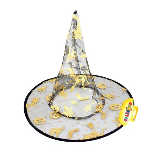 Čarodějnický klobouk s magickými motivy je skvělým doplňkem na Halloween párty nebo karneval! Klobouk je vyroben z černé síťky a je zdoben zlatými obrázky. Staň se hvězdou večírku díky tomuto klobouku!