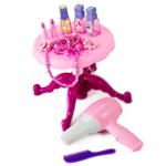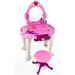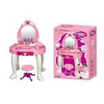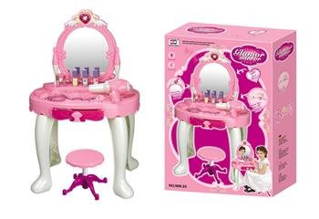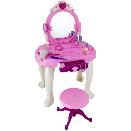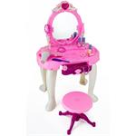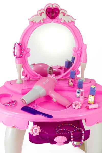Toaletka má odkládací stolek se zásuvkou na poklady a velké zrcadlo. V něm se bude slečna shlížet na růžovobílé stoličce, která je otočná, aby se viděla ze všech stran. Zrcadlo je ozdobeno červeným srdcem, které po stisknutí hraje a svítí.