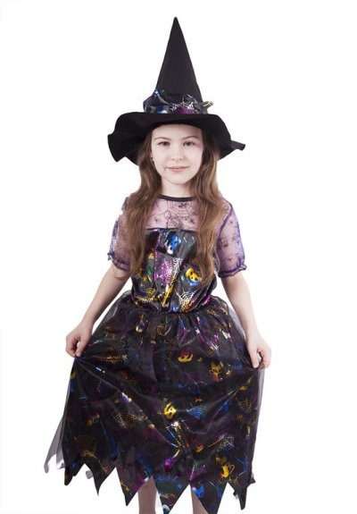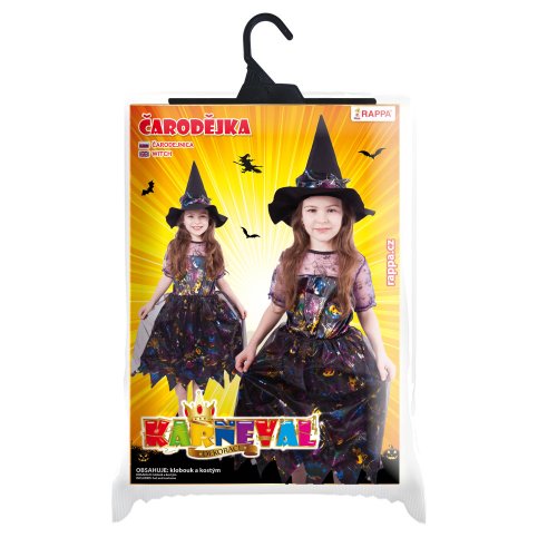Karnevalový kostým pro malé čarodějnice! Kostým černo-fialové barvy ve velikosti M je určen pro holčičky ve věkovém rozmezí 6-8 let (117-128 cm). Šaty jsou dekorovány barevnými halloweenskými motivy. Součástí kostýmu je perfektně sladěný čarodějnický klobouk. S tímto úchvatným kostýmem se zaručeně staneš hvězdou karnevalu i Halloweenu! Koště není součástí.