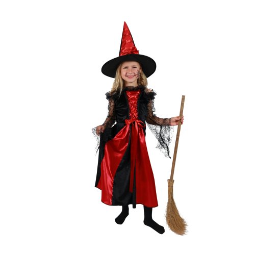Roztomilý karnevalový kostým černo-červené barvy udělá radost každé holčičce! Souprava obsahuje šaty s pavučinkovými rukávy a klobouk s mašlí. Set ve velikosti S je určen pro holčičky ve věkovém rozmezí 4-6 let (105-116 cm). Vhodný i na oslavu Halloweenu! Koště ani hůlka nejsou součástí balení.