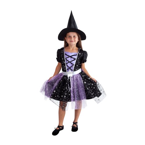 Parádní karnevalový kostým s motivem čarodějnice! Kostým fialovo-černé barvy ve velikosti S je určen pro holčičky ve věkovém rozmezí 3-6 let (105-116 cm). Šaty jsou zdobené potiskem stříbrných hvězdiček. Součástí balení je perfektně sladěný klobouk. Staň se hvězdou karnevalového nebo Halloweenského večírku! Nejen letos je potřeba myslet EKO-nomicky i EKO-logicky! EKO-balení je vhodné zejména pro e-shopy kde zákazník nakupuje dle fotografie a není třeba velkého balení s věšákem. EKO-logicky – na balení bylo použito méně plastu a dalších materiálů. Jedná se o malý transparentní obal s fotografií. EKO-nomicky –EKO-obal zabere jen polovinu místa – šetřete skladová místa s námi!