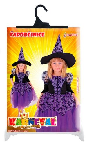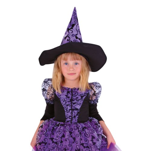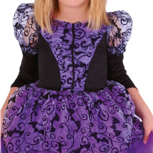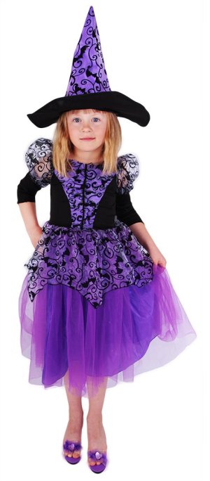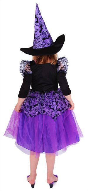 Nádherný kostým pro všechny malé čarodějnice! Kostýmek o velikosti M je určen pro holčičky ve věkovém rozmezí 6-8 let (117-128 cm). Fialové šaty s nadýchanou sukní a tříčtvrtečním rukávem jsou zdobeny černým netopýřím vzorem. Součástí balení je také perfektně sladěný, stejně zdobený klobouk. Skvěle se hodí i na oslavu Halloweenu!