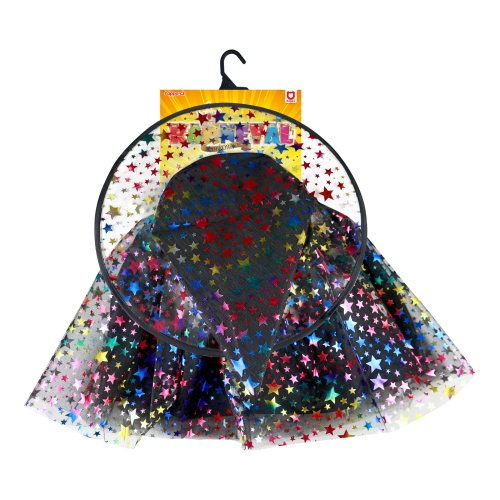 Magický kostýmek pro malé čarodějnice v černé barvě, zdobený barevným dekorem hvězdiček. Kostým je určen pro holčičky ve věkovém rozmezí 3-7 let. Balení obsahuje nadýchanou sukničku a k tomu perfektně sladěný klobouk. Délka sukýnky je cca 30 cm. Sukně je v pase na gumičku. Vhodný i na oslavu Halloweenu.