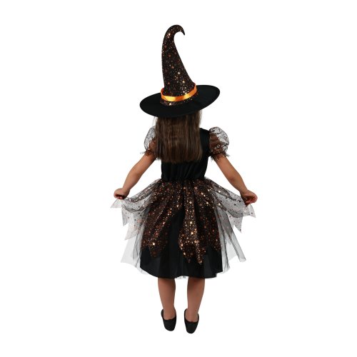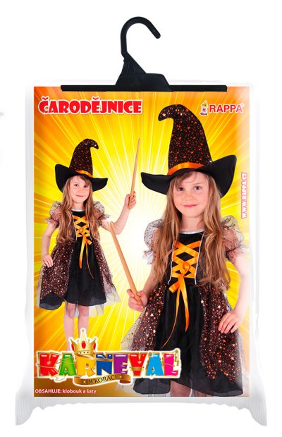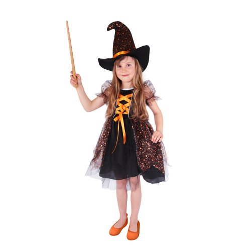 Magický karnevalový kostým pro malé čarodějnice! Kostým černé barvy ve velikosti S je určen pro holčičky ve věkovém rozmezí 3-6 let (105-116 cm). Šaty jsou dekorovány oranžovými stuhami a metalickými hvězdičkami. Součástí kostýmu je perfektně sladěný čarodějnický klobouk. S tímto úchvatným kostýmem se zaručeně staneš hvězdou karnevalu i Halloweenu!