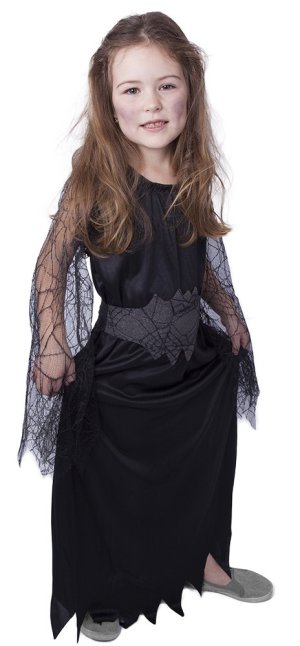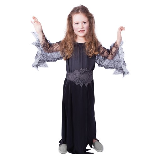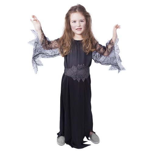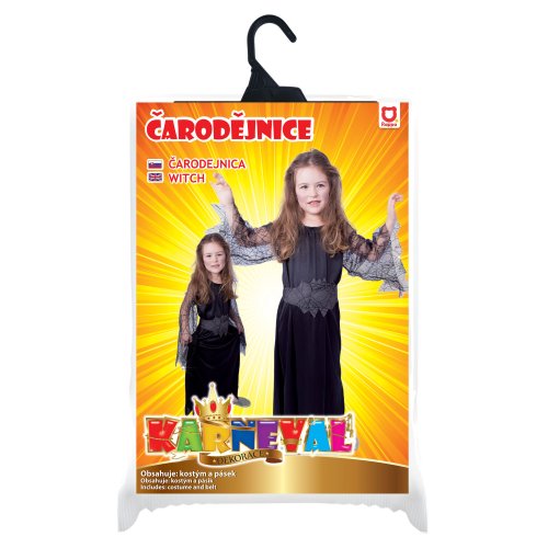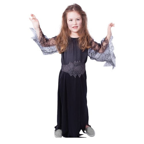 Kostým pro malé čarodějnice! Kostým černé barvy ve velikosti M je určen pro holčičky ve věkovém rozmezí 6-8 let (116-128 cm). Šaty jsou dekorovány průhlednými rukávy s motivem pavučin. S tímto úchvatným kostýmem budeš vypadat jako pravá čarodějka! Skvěle se hodí i na oslavu Halloweenu!