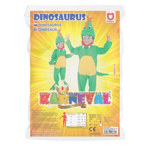 Veselý kostým dinosaura ve velikosti S. Kostým má dvě části - overal s ocasem a nasazovací hlavu s otevírací pusou. Velikost S je určena pro děti ve věkovém rozmezí 4-6 let (105-116 cm). Nejen letos je potřeba myslet EKO-nomicky i EKO-logicky! EKO-balení je vhodné zejména pro e-shopy kde zákazník nakupuje dle fotografie a není třeba velkého balení s věšákem. EKO-logicky – na balení bylo použito méně plastu a dalších materiálů. Jedná se o malý transparentní obal s fotografií. EKO-nomicky –EKO-obal zabere jen polovinu místa – šetřete skladová místa s námi!