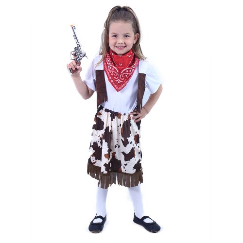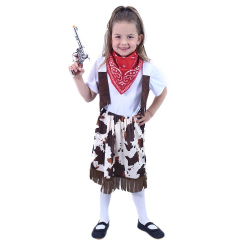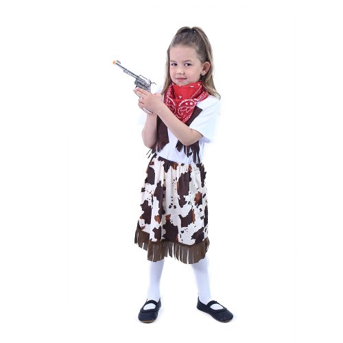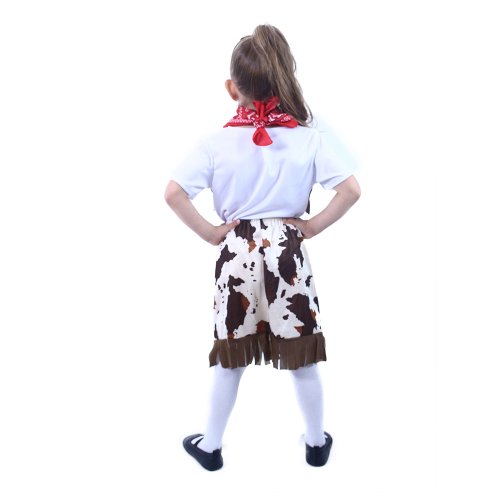 Dětský karnevalový kostým pro malé kovbojky! Kostým ve velikosti S je určen pro děvčata ve věkovém rozmezí 4-6 let (105-116 cm). Balení obsahuje tričko s vestou, hnědo-bílou sukni, červený pásek a šátek.