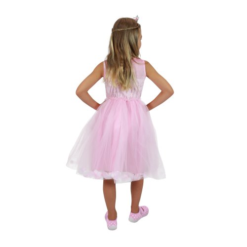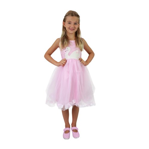 Okouzlující dívčí kostým pro princezny! Kostýmek růžové barvy je kombinován ve spodní části saténovou spodničkou, kterou překrývá růžový tyl, doplněný o okvětní lístky a sněhobílé kuličky. Horní část šatů je dekorována obrázkem labuťě. Kostým princezny ve velikosti M je určen pro holčičky ve věkovém rozmezí 6-8 let (117-128 cm).