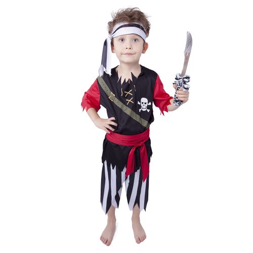 Karnevalový kostým pro opravdického piráta! Kostým ve velikosti S je určen pro chlapce ve věkovém rozmezí 4-6 let (105-116 cm). Pozor, balení obsahuje pásek, horní díl, kalhoty a šátek! Šavle není součástí balení.