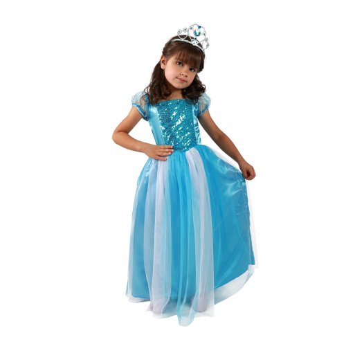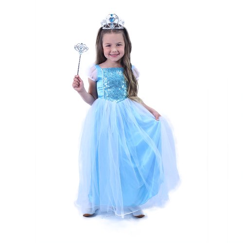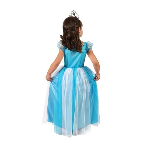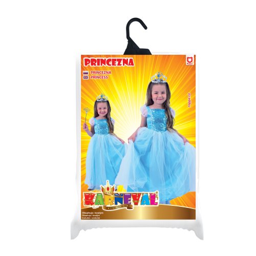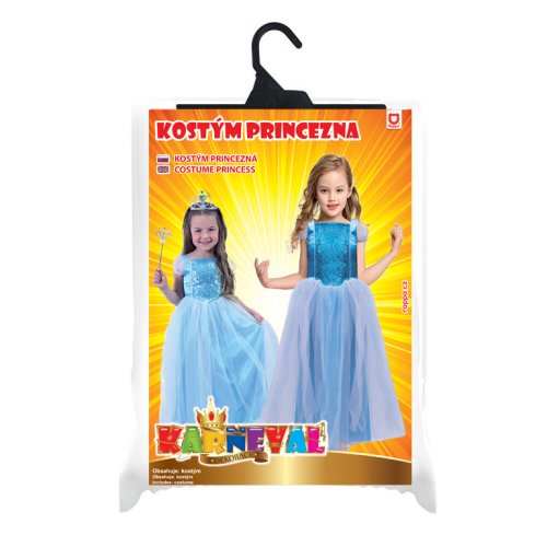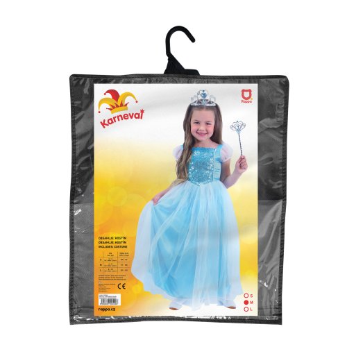 Úchvatný dívčí kostým pro princezny! Kostýmek modré barvy je kombinován s bílým tylem a v horní části dekorován modrými flitry. Kostým princezny ve velikosti M je určen pro holčičky ve věkovém rozmezí 6-8 let (117-128 cm).