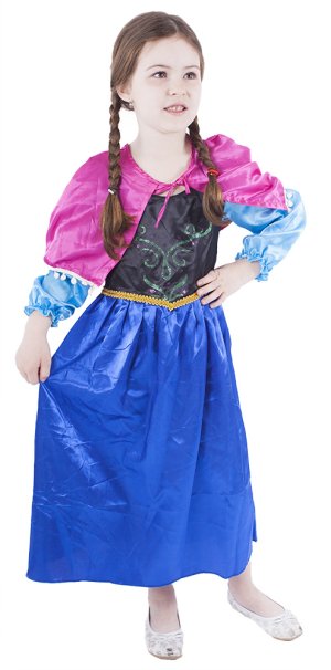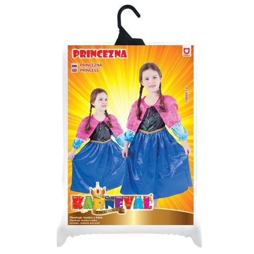 Překrásný dívčí kostým pro všechny sněhové princezny! Kostým ve velikosti S je určen pro holčičky ve věkovém rozmezí 4-6 let (100-116 cm). Velikost se může lišit od vyobrazení na obalu. Kostýmek je ušit v černo-modrých barvách, v horní částí je zdoben potiskem, zlatým lemováním kolem pasu. Součástí je také růžový plášť na mašličku.