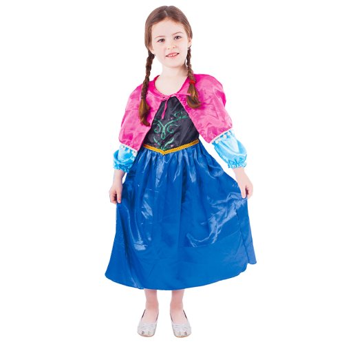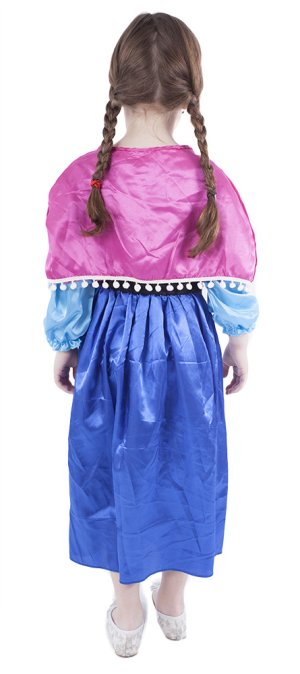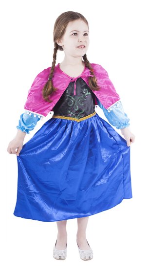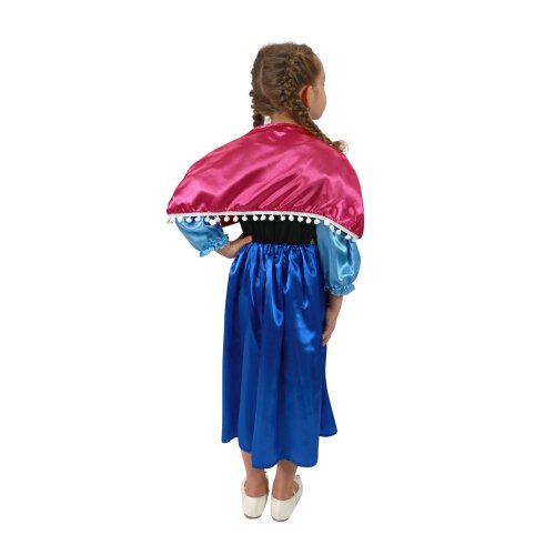 Překrásný dívčí kostým pro všechny sněhové princezny! Kostým ve velikosti M je určen pro holčičky ve věkovém rozmezí 6-8 let (117-128 cm). Velikost se může lišit od vyobrazení na obalu. Kostýmek je ušit v černo-modrých barvách, v horní části je zdoben potiskem, zlatým lemováním kolem pasu. Součástí je také růžový plášť na mašličku.
