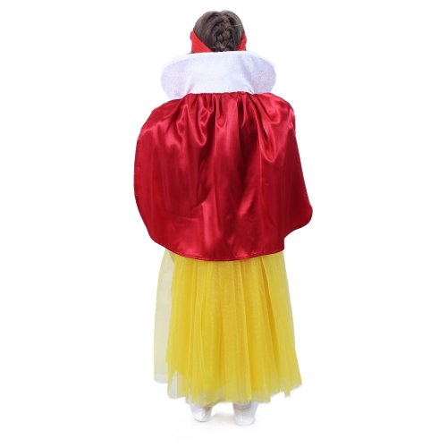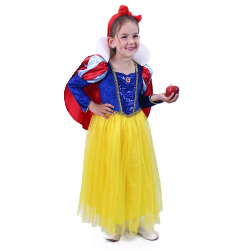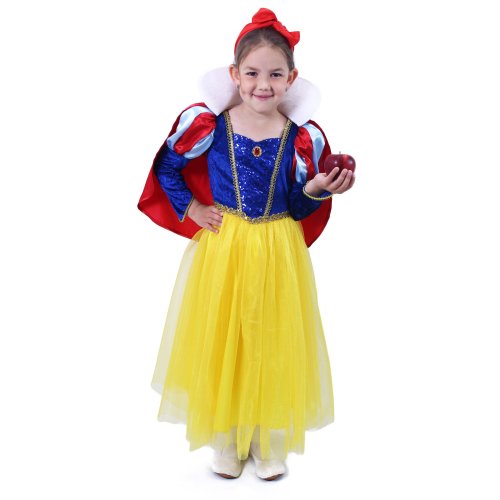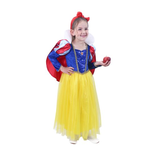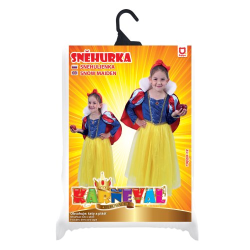 Proměň se během chvilky v půvabnou Sněhurku! Kostýmek o velikosti S je určen pro holčičky ve věkovém rozmezí 4-6 let (105-116 cm). Barevný kostým je dekorován v přední části modrými flitry a zlatým zdobením. Součástí je odnímatelný červený plášť s bílým límcem. Neobsahuje mašli do vlasů.