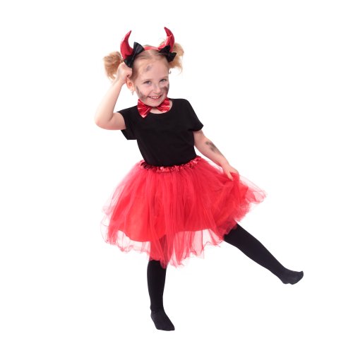Roztomilý čertovský kostýmek s TUTU sukýnkou je určen pro holčičky ve věkovém rozmezí 3-7 let (104-146 cm), obvod pasu 46-72 cm. Nadýchaná tylová sukýnka s čertovským ocáskem, typické červené barvy je v pase na gumu. Součástí této sady je senzační čelenka s rohy a motýlek na krk! Délka sukýnky je cca 40 cm.