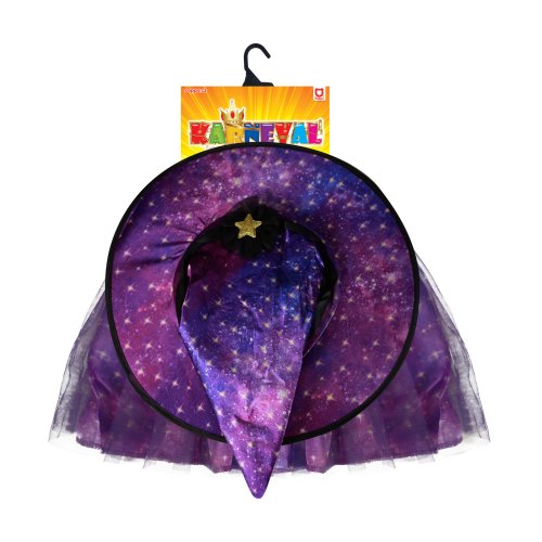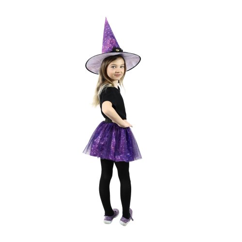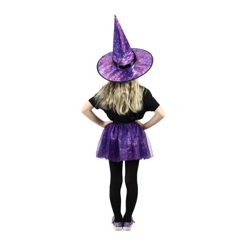 Magický kostýmek fialové barvy zdobený dekorem hvězdiček je určen pro holčičky ve věkovém rozmezí 3-7 let. Balení obsahuje nadýchanou sukničku a k tomu perfektně sladěný klobouk. Sukně je v pase na gumičku. Vhodné i na halloween.