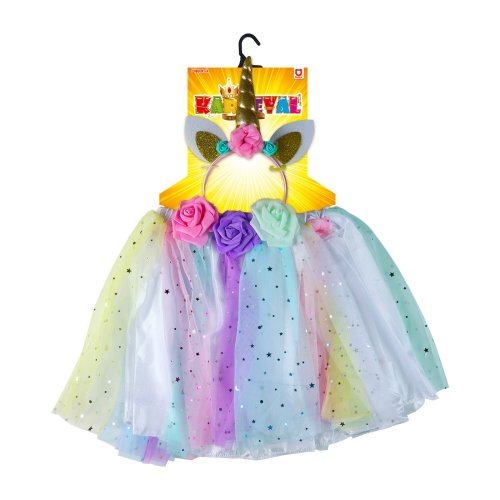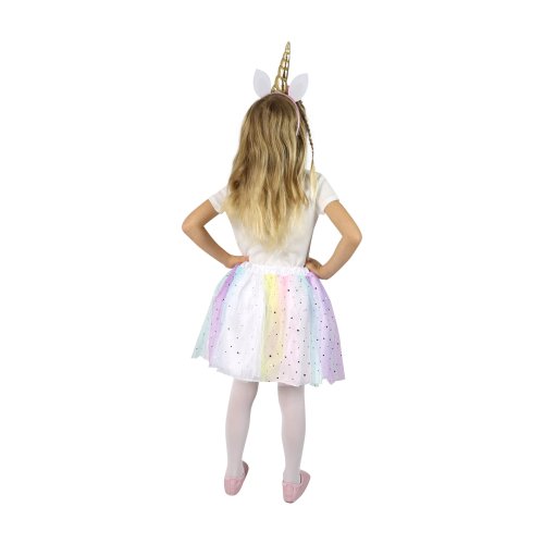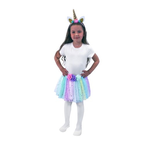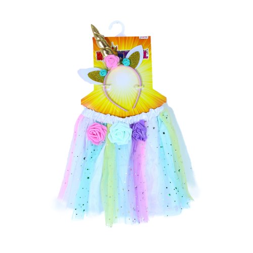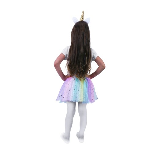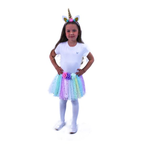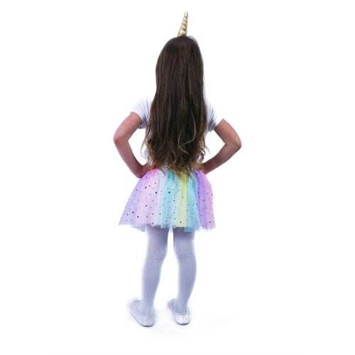 Roztomilá saténová sukýnka TUTU je zdobena barevným tylem s dekorem hvězdiček. Je určena pro holčičky ve věkovém rozmezí 3-10 let (104-146 cm), v pase je na gumu a její délka je cca 26 cm. Součástí této sady je senzační čelenka jednorožce se zlatým rohem a ušima!