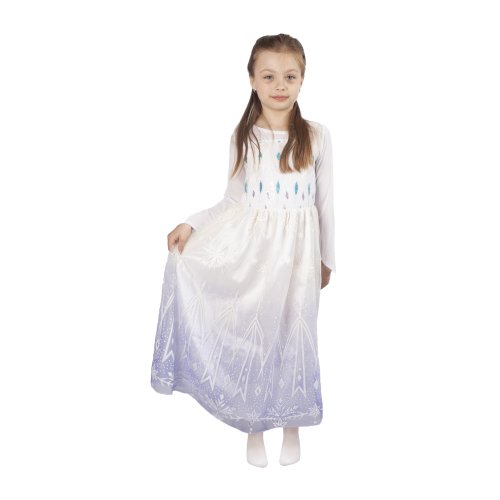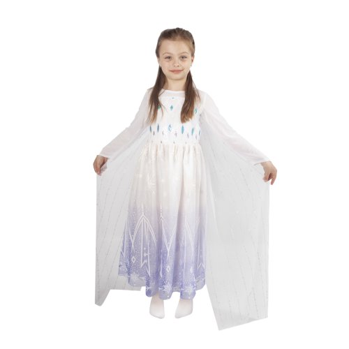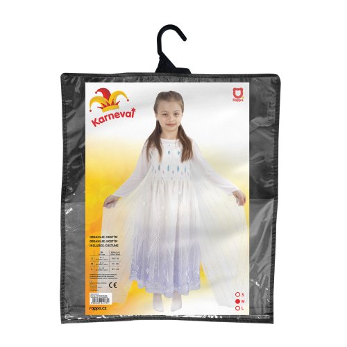 Úchvatný dívčí kostým pro všechny zimní princezny! Dlouhé šaty v bílé barvě jsou v horní části zdobené flitry, od pasu dolů je bílo-fialová tylová sukně zdobena potiskem. Součástí šatů je také vlečka dekorována flitry. Kostým ve velikosti M je určen pro holčičky ve věkovém rozmezí 6-8 let (117-128 cm).