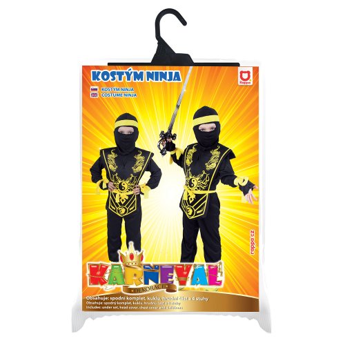 Karnevalový kostým ninja ve velikosti S je určen pro chlapce ve věkovém rozmezí 4-6 let (105-116 cm). Balení obsahuje overal, vestu zdobenou žlutými bojovnými motivy, kuklu, čelenku, opasek a pásky na ruku.