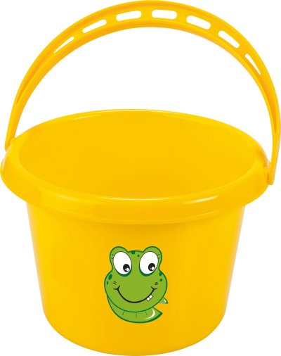Dětský plastový kyblík ve žluté barvě s obrázkem s dětským motivem.
