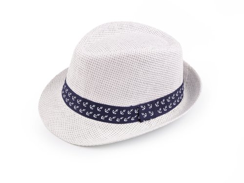 Letní dětský klobouk zdobí stuha s potiskem kotviček. V teplých dnech klobouk skvěle ochrání před sluncem, je velmi lehký a prodyšný. Je velice oblíbený, děti rádi vypadají jako dospěláci, což jim klobouk typu Fedora umožní. Šířka krempy je 4 cm. Jednotlivé části klobouku.