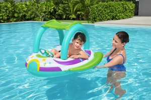 Bestway® Dětský nafukovací člun se stříškou Space Splash™ je ideální pro děti od 3 let. Člun má sluneční clonu blokující UV záření, která chrání jemnou dětskou pokožku, a je snadno odnímatelná díky uchycení na suchý zip. Děti se do člunu mohou snadno dostat a vystoupit. Člun je vybaven volantem s klaksonem. Průhledové okénko umožňuje speciální pohled pod vodní hladinu. Tři vzduchové komory a bezpečnostní ventily dodávají této dětské loďce stabilitu a bezpečnost. Nafouknutá velikost člunu: 61 x 95 x 98 cm. Nenafouknutá velikost člunu: 107 x 112 cm. Rozměry balení: 24 x 24 x 8,5 cm. Určeno pro 1 osobu. Maximální nosnost: 45 kg. Používejte pouze pod dohledem dospělé osoby. Věk: 3+