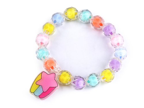 Půvabný dětský náramek s ozdobou potěší všechny malé parádnice. Náramek je vyrobený z plastových korálků navlečených na pružné gumičce. Pohodlně se navléká na ruku. Ozdoba je plochá, má různý motiv. Volně položený vnitřní obvod náramku měří 14 cm. Náramky jsou na papírové kartě, která má otvor pro zavěšení na prodejní stojan.