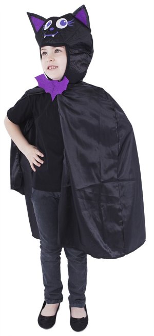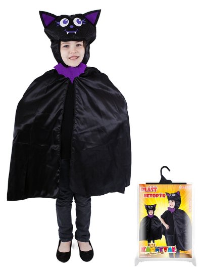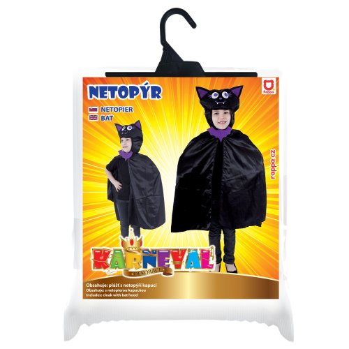 Roztomilý karnevalový kostým třeba i na Halloween párty s motivem netopýra v černo-fialové barvě a v univerzální velikosti je určen pro děti ve věkovém rozmezí 3-10 let (104-150 cm). Balení obsahuje plášť s kapucí.