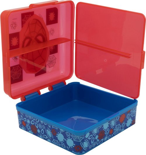 Plastový svačinový box s motivem SPIDERMAN, má jednu velikou přihrádku ve spodní části a ve víčku jsou dvě menší přihradky rozdělené vnitřní prepážkou. Jednoduchý a bezpečný uzávěr.