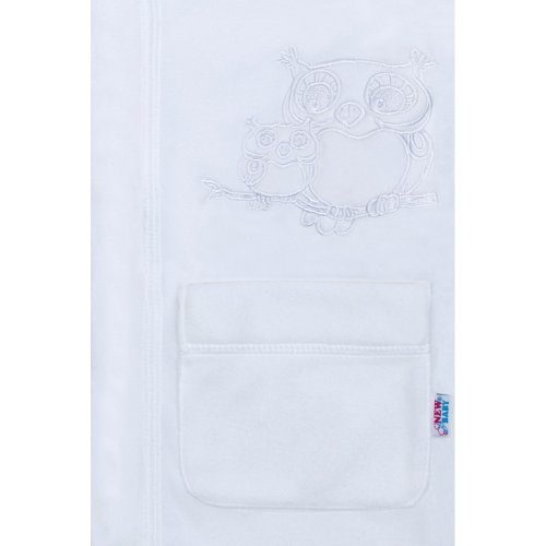 Dětský župan New Baby Sovičky. Župan zdobí obrázek soviček, kapuce a dvě kapsy. Kapucka chrání mokrou hlavičku před chladem a měkký, teplý materiál je ideální pro citlivou dětskou pokožku. Dětský župan se zavazuje na šňůrky. Rozměr: délka od ramínek cca 68 cm, obvod kolem hrudníku cca 82 cm, délka rukávu cca 35 cm. Složení 100% polyester.