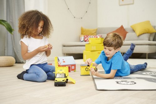 DHL Delivery sada - dodávka na volnoběh, poštovní kolo, výdejní box DHL, figurka kurýra a další doplňky. Otevíratelné části, se světelnými a zvukovými efekty. Délka 25 cm, barva žlutá.