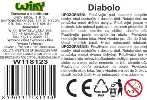 Diabolo - zábavná hra nejen pro děti! Roztoč diabolo pomocí paliček! Důležité je mít natažené provázky! Diabolo můžeš vyhazovat, chytat a provádět spoustu dalších kousků, které se naučíš! Při hře si procvičíš svou šikovnost, motorickou zručnost a trpělivost. Velikost: 35 cm (paličky). Rozměry balení 18 x 43 x 12 cm. Vhodné pro děti od 3 let.