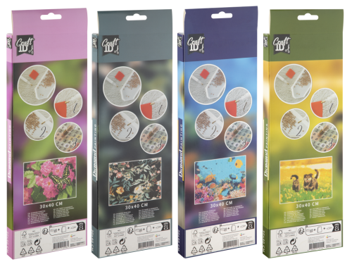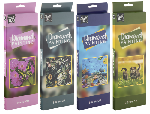 Oblíbená kreativní sada Diamond Painting pro vytvoření zářivého obrázku z barevných kamínků!Jednoduchá a zábavná technika, která rozvíjí trpělivost, soustředění a kreativitu – vhodná pro děti i dospělé. Balení obsahuje: samolepicí plátno s předtištěným motivem (30 × 40 cm), sada barevných akrylových „diamantů“, aplikátor (pero) na nanášení kamínků, voskový polštářek a miska na třídění kamínků. Čtyři různé motivy.