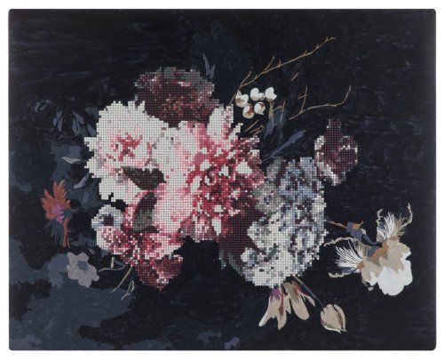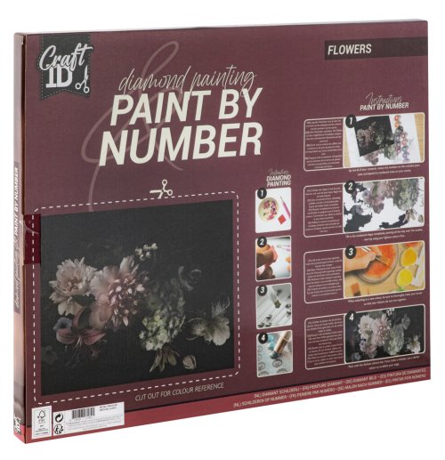 Malování pomocí kamínků Diamond/podle čísel Květiny 40×50 cm. Tento obrázek kombinuje dvě techniky pomocí kamínků a malování podle čísel. Součástí balení vodové barvy, štetec, aplikátor, kamínky a obrázek.