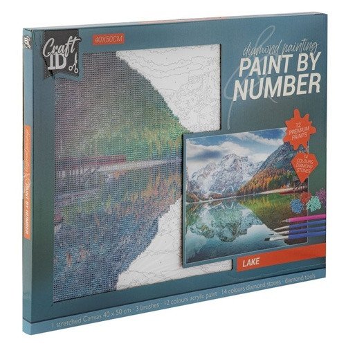 Malování pomocí kamínků Diamond/podle čísel Jezero 40×50 cm. Tento obrázek kombinuje dvě techniky pomocí kamínků a malování podle čísel. Součástí balení vodové barvy, štetec, aplikátor, kamínky a obrázek.