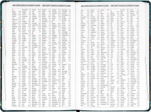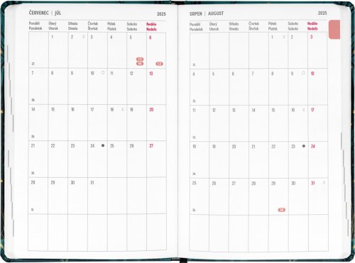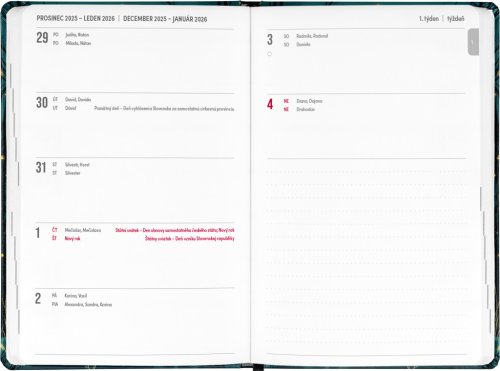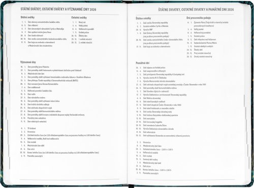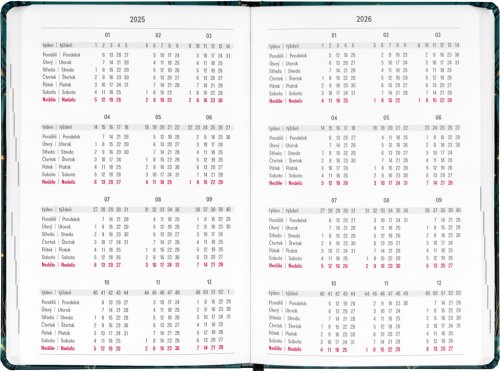 Osmnáctiměsíční diář obsahuje přehled na rok 2025 a 2026, seznam českých a slovenských jmen, česko-slovenské týdenní řádkové kalendárium se jmény a svátky a prostor na poznámky. Kalendárium začíná v červenci 2025 a končí v prosinci 2026.