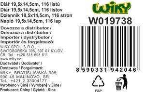 Diář v dálkovém balení. 116 různých (linkovaných, čtverečkovaných atd.) stran. 4 různé barevné provedení. Velikost dárkového balení - 17x4x22 cm. Velikost diáře - 14,5x19,5 cm.