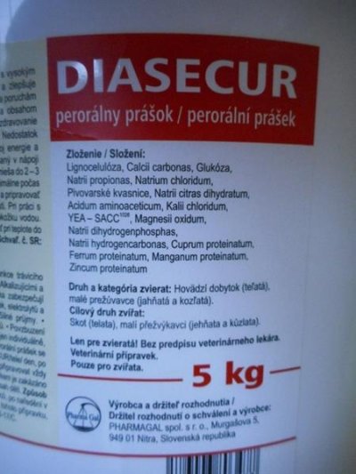 Složení veterinárního přípravku: Lignoceluloza, Calcii carbonas, Glukóza, Natrii propionas, Natrium chloridum, Pivovarské kvasnice, Natrii citras dihydratum, Acidum aminoaceticum, Kalii chloridum, YEA – SACC1026, Magnesii oxidum, Natrii dihydrogenphosphas, Natrii hydrogencarbonas, Cuprum proteinatum, Ferrum proteinatum, Manganum proteinatum, Zincum proteinatum Charakteristika: Dietetický přípravek s vysokým obsahem vlákniny pomáhající optimalizovat funkce trávicího systému. Pomáhá eliminovat choroboplodné zárodky v trávicím traktu a zlepšuje konzistenci výkalů. Alkalizujícími a neutralizačními látkami jakožto i pivovarskými kvasnicemi předchází poruchám trávení. Probiotika zabezpečují osídlení trávicího traktu žádoucími mikroorganismy a obsahem organicky vázaných minerálních látek, elektrolytů a glukózy nahrazuje deficit látek potřebných pro uzdravování průjmujících telat.