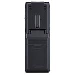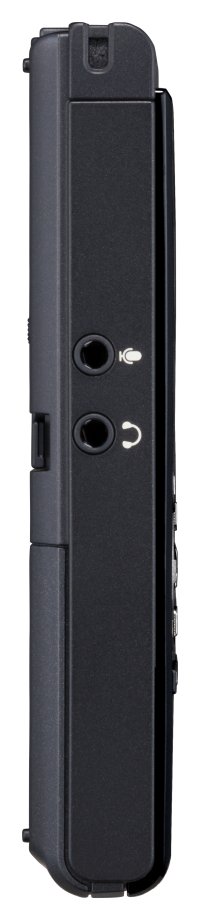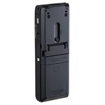 Digitální záznamník OM SYSTEM s výsuvným USB portem na zadní straně diktafonu.