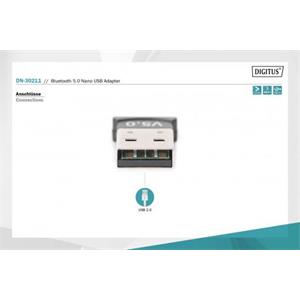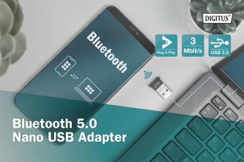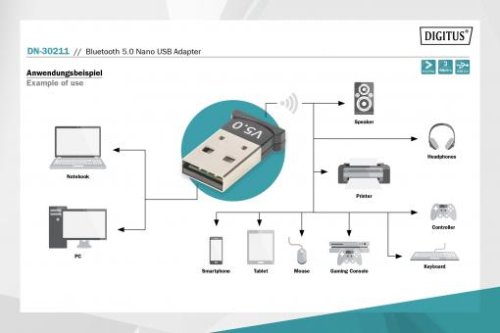 S adaptérem DIGITUS® Bluetooth USB můžete používat rychlý standard Bluetooth 5.0 s vysokými přenosovými rychlostmi až 3 Mb / s. To vám umožní přenášet soubory, obrázky nebo hudbu rychle a ve vysoké kvalitě. Adaptér lze použít pro mobilní zařízení, pro připojení mezi počítači, pro připojení příslušenství Bluetooth všeho druhu a je podporován nejběžnějšími herními konzolami. Patří mezi ně řadiče, sluchátka, reproduktory, klávesnice, myši, tiskárny, tablety nebo smartphony. Je také možné použít duální režim, funkci LAN, ovládání tiskárny a funkci sériového portu (SPP). Dosah Bluetooth dongle je mezi 10 a 20 metry v závislosti na místních podmínkách. Funkce BLE zajišťuje, že spotřeba energie je vždy přizpůsobena aktuálně požadované kapacitě.