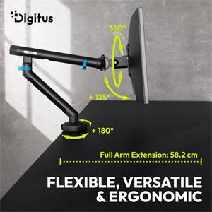 Plně mobilní držák pro jeden monitor je ideálním řešením pro moderní pracovní stanice, kde je flexibilita, ergonomie a organizace prvořadá. Tento držák je určen pro obrazovky do 35 palců a s nosností až 10 kg, takže je vhodný jak pro ploché, tak pro zakřivené monitory. Díky integrovanému pružinovému napínacímu mechanismu lze monitor plynule nastavit na příslušnou hmotnost bez použití nářadí – pro dokonalou rovnováhu a snadné nastavení v jakékoli poloze. Držák nabízí maximální mobilitu: otáčení, naklápění, otáčení a nastavení výšky umožňují ergonomické nastavení monitoru podle individuálních požadavků. Praktická funkce rychloupínání VESA umožňuje rychlé a snadné připevnění nebo odebrání obrazovky, zatímco rychloupínací spojka usnadňuje instalaci držáku. Díky svému prostorově úspornému designu a integrovanému systému správy kabelů držák monitoru nejen zajišťuje úhledný vzhled, ale také maximalizuje využitelnou pracovní plochu. Dvě možnosti montáže – stolní svorka nebo průchodka – nabízejí dodatečnou flexibilitu montáže. Držák je kompatibilní se standardy VESA 75x75 a 100x100, a proto je všestranný.