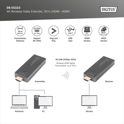 Bezdrátově přenáší HDMI video a audio signály v UHD 4K/30Hz na vzdálenost až 30 m s ničím nerušeným výhledem