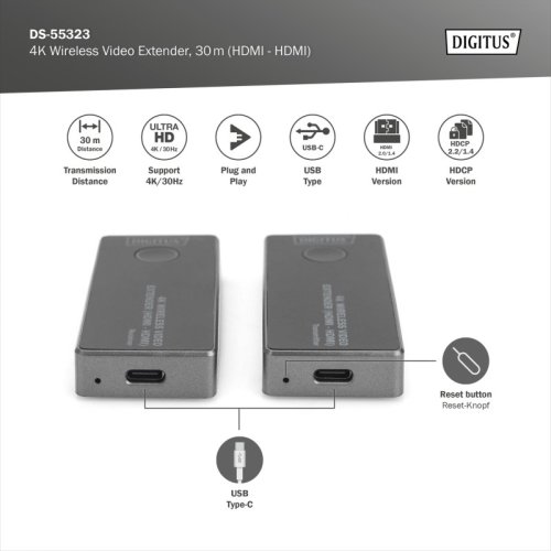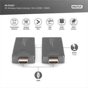 Zažijte bezdrátový přenos zvuku a videa v ostrém rozlišení UHD 4K/30Hz s 4K Wireless HDMI Extender. Sada je navržena pro snadné nastavení bez ovladače nebo softwaru díky Plug & Play. S dosahem až 30 metrů s ničím nerušeným výhledem zaručuje spolehlivý přenos. Šifrování AES 128 a protokol WPA2 zajišťují bezpečný přenos dat. Kompatibilní s HDMI 2.0/1.4 a HDCP 2.2/1.4. To je ideální pro domácí kina, konferenční místnosti a školicí zařízení. Objevte svobodu bezdrátové zábavy!