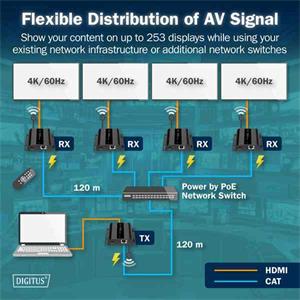 Sada HDMI IP Extender, 4K/60Hz umožňuje přenos HDMI AV signálů v ultra vysokém rozlišení 4K (4096x2160p při 60Hz) na velké vzdálenosti až 200 metrů - díky výkonnému point-to-point připojení přes síťový kabel CAT6 nebo vyšší. Sada je plně napájena přes síťový přepínač PoE, nejsou potřeba žádné externí napájecí zdroje. Rozšíření přes IP umožňuje flexibilní škálování systému a podporuje až 253 přijímačů (displejů) pro point-to-multipoint přenos. Kromě toho lze využít stávající síťovou infrastrukturu 1G, což umožňuje neomezený dosah signálu díky kaskádování přes síťové přepínače. Pro ještě větší flexibilitu jsou samostatně k dispozici další přijímače (RX) (model: DS-55354). Vynikající kvalita obrazu je vždy zachována: Díky nízké latenci pouhých 150-220 ms je přenos plynulý a ostrý v UHD. Další praktickou funkcí je integrované IR rozhraní, které umožňuje dálkové ovládání vstupního zdroje přímo z výstupní obrazovky. Zařízení je také vhodné pro montáž na stěnu, což umožňuje prostorově úspornou instalaci. Ideální pro profesionální AV aplikace, domácí kina nebo použití ve firmách – tato sada HDMI IP extenderů kombinuje nejvyšší kvalitu přenosu s maximální flexibilitou.